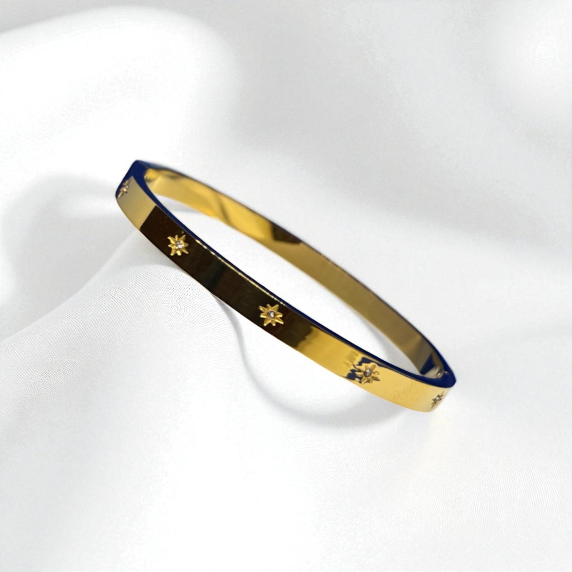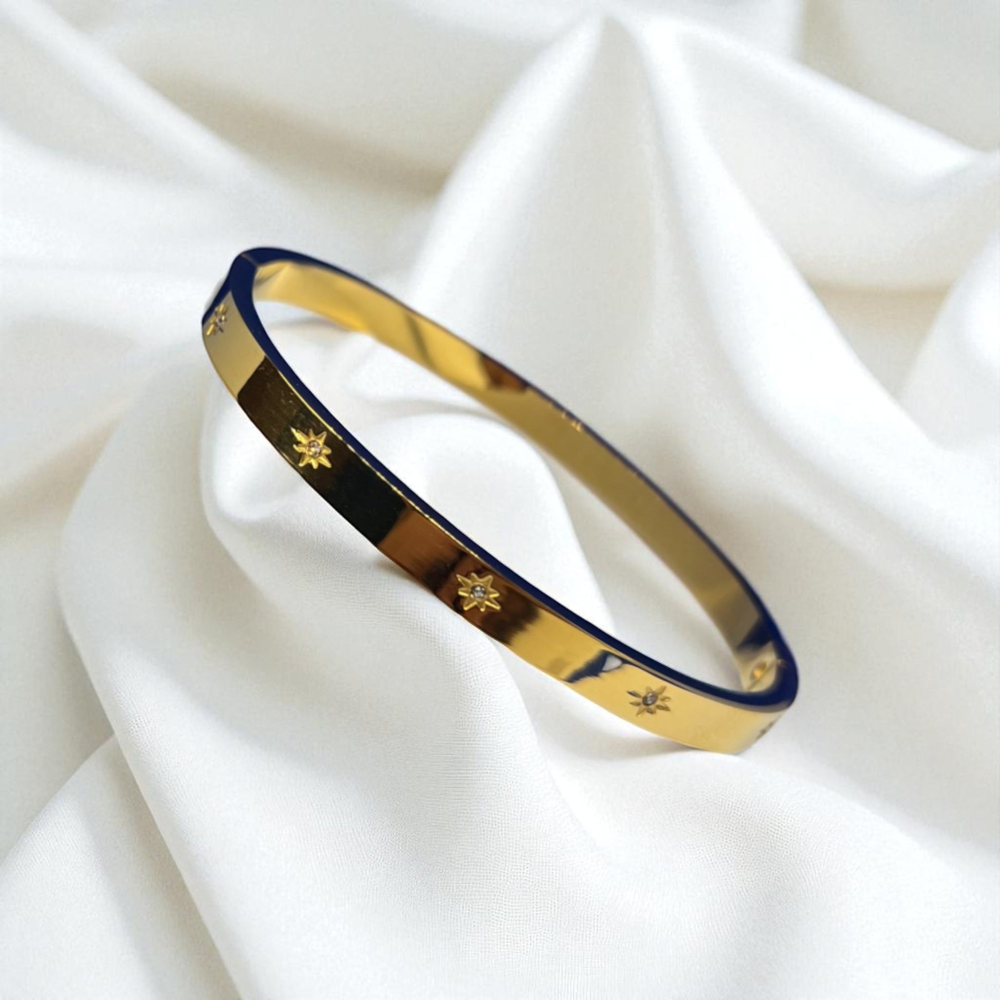 Elevate your style with the Elizabeth Prestige Diadem Bangle Bracelet, a piece that radiates understated glamour and timeless allure. This exquisite bangle is crafted from a lustrous, polished gold-toned metal, presenting a sleek and elegant silhouette. Adorning its surface are meticulously placed starburst motifs, each subtly embellished with shimmering accents that catch the light with every movement.